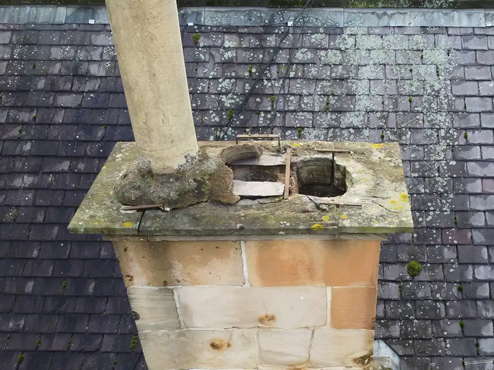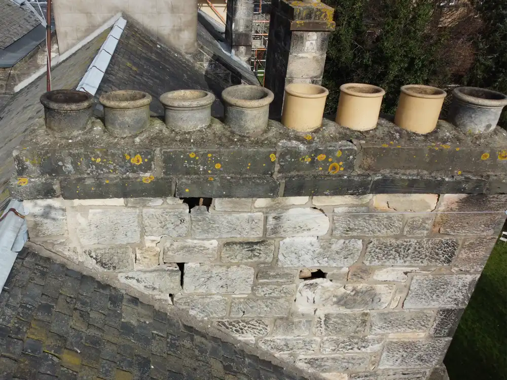Edinburgh’s frequent freeze-thaw cycles can weaken mortar and stonework, making high resolution drone footage invaluable for spotting issues early. Drone technology allows a level of precision and safety that traditional methods often cannot achieve, checking for cracks, loose masonry, weather erosion, and signs of movement. Drone surveys help identify structural defects early, prevent water ingress, and protect both the building fabric and residents without the need for scaffolding or risky roof access. Many tenement chimneys are constructed from sandstone, which can deteriorate over time. Drone inspections allow surveyors to zoom in on stonework and brickwork to assess spalling, eroded mortar joints, failed pointing, and evidence of water penetration. The ability to visually inspect every surface especially those at height or behind obstructions means defects are identified quickly and accurately. Recommendations such as lime repointing or stone repair can then be based on clear photographic evidence.